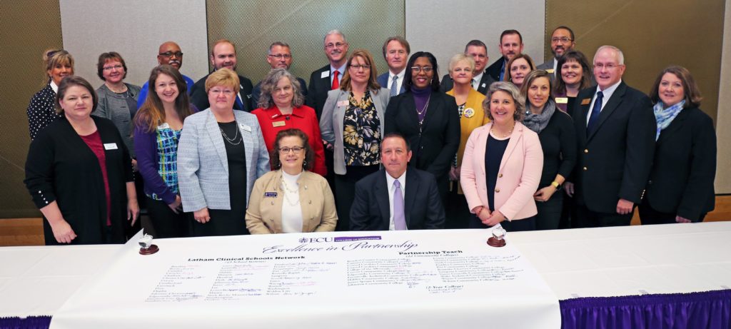 Representatives from the 23 colleges that compose Partnership Teach re-signed their agreements with ECU during the event. Public school systems that are members of the Latham Clinical Schools Network also reaffirmed their commitments.